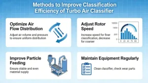 | Airflow rate | Higher airflow = larger cut size (coarser product) | Balance airflow to achieve both target particle distributions |