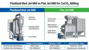 Series use (flat + fluidized bed): For ultra-fine GCC with D97 1–5 μm and large capacity (≥3 t/h), use a flat jet mill for semi-finishing (D97 ~10 μm) and a fluidized bed jet mill for finishing—this reduces the unit energy consumption of the fluidized bed and improves overall production capacity (suitable for large-scale high-end GCC production).