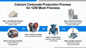To achieve a 1250-mesh (D97 ≈ 10 μm) calcium carbonate (CaCO₃) product, a precision-engineered dry-process production line with specialized ultrafine grinding equipment and strict process control is required . This guide covers the complete workflow, equipment selection, key parameters, and quality control measures to consistently meet this fineness standard. Core Process Overview Raw Ore Preparation → 2. Two-Stage Crushing → 3. Ultrafine Grinding → 4. Precision Classification → 5. Collection & Packaging → 6. Optional Surface Modification 1. Raw Material Requirements Purity: CaCO₃ content ≥ 97% (preferably ≥98%) to ensure high-quality end products Whiteness: ≥ 95% (critical for 1250-mesh applications in paints, coatings, and plastics) Hardness: Mohs hardness ≤ 3 (calcite/limestone is ideal; avoid ores with high silica content) Pre-treatment:…