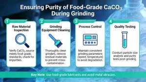 Re-test high-purity raw materials: Even if incoming limestone/PCC slurry is certified food-grade, test every batch for heavy metals (ICP-MS) and purity (titration) before grinding—reject any batch that fails (grinding cannot fix impure raw materials).