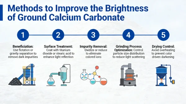 The brightness (whiteness) of ground calcium carbonate is a core quality index for its application in coatings, plastics, papermaking, rubber and other industries. It is mainly determined by the raw material properties of calcite ore and affected by processing technology, impurity removal, and production environment control. The improvement of GCC brightness is a systematic process, starting from raw material selection and covering the whole production chain of crushing, grinding, purification, and post-treatment. Below is a detailed, industrial-feasible technical scheme, divided into core steps and auxiliary optimization measures:
