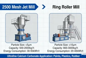 Ultrafine calcium carbonate (2500 mesh, D97≈5μm) is a high-value functional filler widely used in plastics, rubber, coatings, papermaking and other industries, with strict requirements for particle size distribution, whiteness, purity and particle morphology. Jet mill and ring roller mill are the two most commonly used ultrafine grinding equipment for calcium carbonate, and their grinding principles, structural characteristics and application performance are quite different. This guide comprehensively compares the two types of mills from grinding principle, technical performance, production cost, product quality, adaptability and other aspects, and provides selection suggestions for ultrafine calcium carbonate production enterprises.