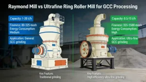 Raymond Mill: It has an absolute advantage in the medium-coarse GCC segment (80–325 mesh): large output and low unit energy consumption. For example, the unit energy consumption of 325 mesh GCC is only 25–35 kWh/t, which is the most cost-effective equipment for mass production of conventional GCC.