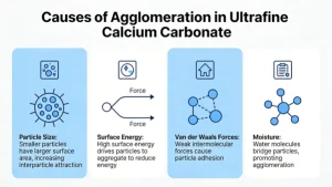 Agglomeration in ultrafine calcium carbonate is primarily driven by high surface energy and interparticle forces, exacerbated by moisture and lack of surface passivation. Effective mitigation requires a combination of surface chemistry control, optimized processing, and proper handling/storage.