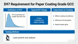 Critical Distinction: Filler-grade GCC for papermaking has a much looser D97 requirement of 13–30 μm, which is not suitable for paper coating applications.