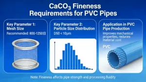 Core Recommended Fineness for PVC Pipe CaCO₃ The most widely used and cost-effective fineness of calcium carbonate (CaCO₃) for PVC pipe manufacturing is800 to 1250 mesh(corresponding to a median particle size d₅₀ of 5~15 μm) for both Ground Calcium Carbonate (GCC, heavy CaCO₃) and Precipitated Calcium Carbonate (PCC, light CaCO₃). This range balances the mechanical performance, processing fluidity, surface finish of the final pipe, and production cost, making it the industry standard for most PVC pipe applications. Fineness Selection by PVC Pipe Type The optimal fineness varies based on the pipe’s application, pressure rating, and performance requirements: Non-pressure PVC pipes (drainage, sewer, DWV, electrical conduit) Basic cost-sensitive formulations: 600~800 mesh (d₅₀≈10~20 μm) GCC, the most economical option for low-demand non-pressure…