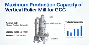 The maximum production capacity of a vertical roller mill for GCC (Ground Calcium Carbonate) varies significantly depending on the desired product fineness and the specific mill model.