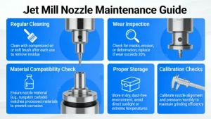 Nozzle Disassembly: Remove nozzles from the grinding chamber (use plastic tools to avoid chipping ceramic nozzles) — clean the nozzle mounting seat with dry compressed air (remove powder buildup).
