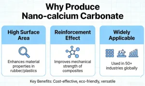 ✅ The primary purpose of producing nano calcium carbonate is to: Leveragenanoscale effects to overcome the performance limitations of conventional calcium carbonate and enable advanced applications in high-tech manufacturing and new materials.
